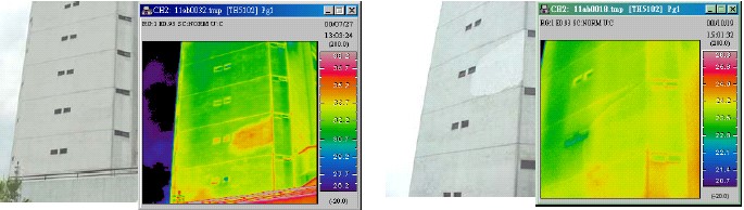 圖2:某醫院大樓存在嚴重的空股,左圖為維修前紅外圖像;圖右為維修后紅外熱像儀拍攝的圖像